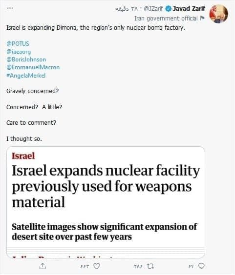 وزیر امور خارجه ایران در پیامی در توییتر با اشاره به اقدام رژیم صهیونیستی در توسعه سایت هستهای دیمونا، از عدم واکنش مقامهای غربی انتقاد کرد.