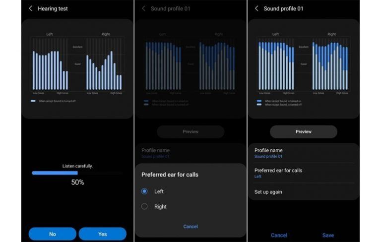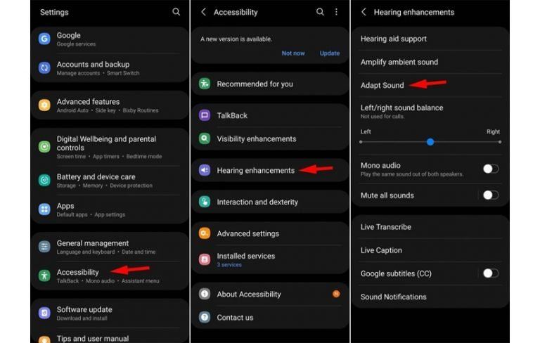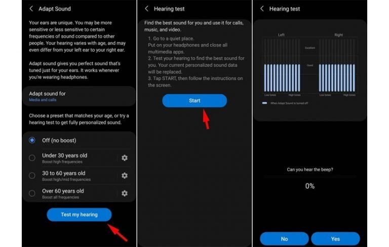 برای انجام این کار باید ابتدا وارد تنظیمات شده و در بخش Accessibility، گزینهی Hearing enhancements را انتخاب کنید. در صفحهی باز شده، گزینهی Adapt sound را انتخاب کنید. در صفحهی جدید وارد بخشی میشوید که از شما میخواهد محدودهی سنی خود را انتخاب کنید. در نهایت به صفحهی تست هدایت میشوید که با لمس گزینهی Start، تست آغاز میشود. در این بخش در صورت شنیدن صدای بوق، «بله» و در صورتی که صدا را نمیشنوید، گزینهی «خیر» را لمس کنید.