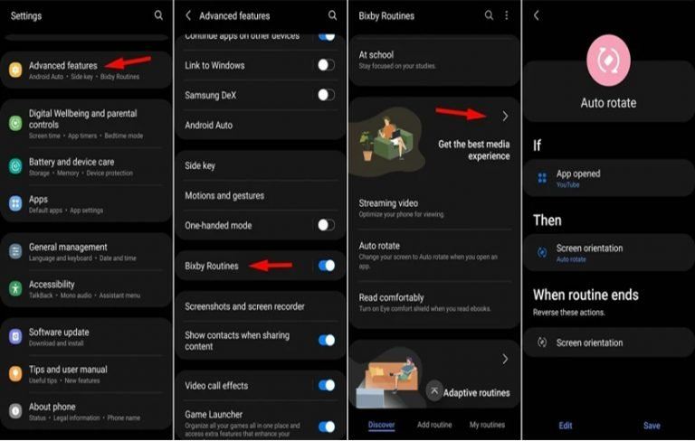 برای انجام این کار تنها کافی است وارد تنظیمات گوشی شده و از بخش Advanced features، گزینهی Bixby Routines و در نهایت هم Get the best media experience را انتخاب کنید. در صفحهی باز شده، میتوانید تعیین کنید اگر اپلیکیشنی مربوط به رسانه نظیر یوتیوب اجرا شود، صفحه به صورت خودکار به صورت افقی درآید تا بدین ترتیب بدون اینکه نیازی به فعال کردن این حالت به صورت دستی باشد، هربار که وارد یوتیوب میشوید گوشی به صورت خودکار صفحه را افقی کند.