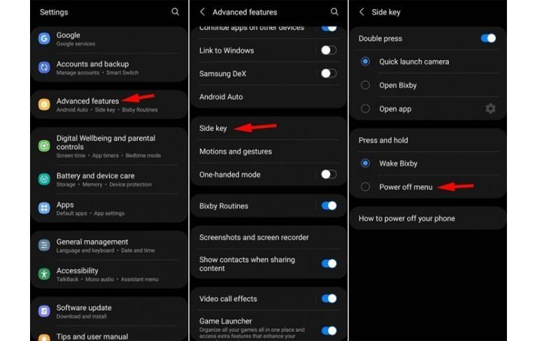 اما اگر قصد دارید گوشی را با کلید پاور خاموش یا روشن کنید کافی است وارد تنظیمات شده و در بخش Advanced Features، گزینهی Side Key را انتخاب کنید. در این بخش میتوانید انتخاب کنید با یک بار فشردن کلید پاور یا نگه داشتن آن، گوشی چه واکنشی نشان دهد که خوشبختانه خاموش کردن گوشی هم بخشی از گزینههاست. شما عزیزان میتوانید نحوهی انجام این کار را در تصاویر زیر مشاهده کنید.