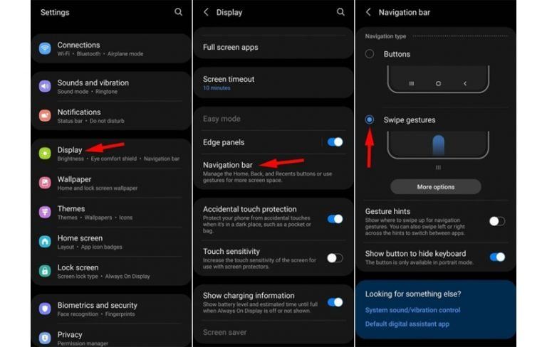 همچنین میتوانید در تنظیمات مربوط به صفحهی نمایشگر، ژستهای ناوبری را هم تغییر داده و به جای کلیدهای روی صفحه، تنها با سوایپ به بالا، تمام سه حالت بازگشت به عقب، کلید وسط و منوی برنامههای اخیر را انجام دهید. بعد از فعال کردن این گزینه شاید کار کردن با گوشی کمی برایتان سخت باشد اما بعد از مدت کوتاه به آن عادت خواهید کرد و میتوانید یک تجربهی لذتبخش از کار با یک گوشی تمام صفحه داشته باشید.