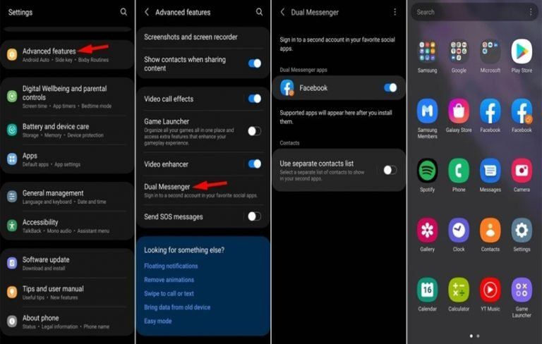 برای انجام این کار کافی است وارد تنظیمات شده و در بخش Advanced features، گزینهی Dual messenger را انتخاب کنید. به همین سادگی میتوانید از هر برنامهای که نسخهی اصلی آن را در گوشی نصب دارید و از این قابلیت پشتیبانی میکند، یک نسخهی کپی شده هم روی گوشی داشته باشید. لازم به ذکر است در کنار اپلیکیشن مربوطه یک دایرهی کوچک نارنجی رنگ هم ظاهر میشود. (بسیاری از اپلیکیشنهای اجتماعی از این قابلیت پشتیبانی میکنند).