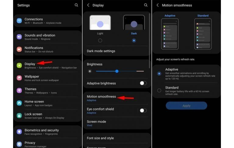 برای فعال یا غیرفعال کردن این قابلیت کافی است به تنظیمات رفته و در بخش Display، گزینهی Motion smoothness را انتخاب کنید. در صفحهای که باز میشود، میتوانید صفحه را روی رفرش ریت ۶۰ یا ۱۲۰ هرتز قرار دهید.