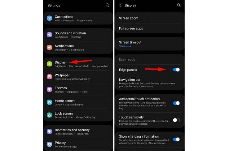 برای فعال کردن این قابلیت کافی است به تنظیمات گوشی رفته و در بخش Display، گزینهی Edge Panels را انتخاب کنید. لازم به ذکر است یا میتوانید آیکون فعال/غیرفعال را لمس کرده و قابلیت را با حالت پیشفرض استفاده کنید یا با کلیک روی آن، وارد تنظیمات مربوطه شده و تغییرات دلخواه خود را اعمال کنید.