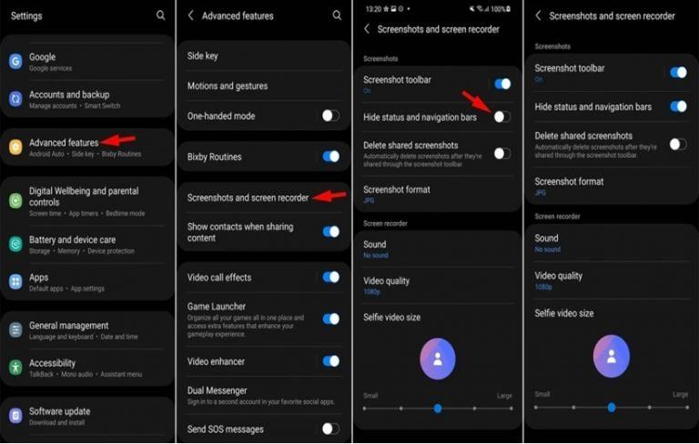 برای انجام این کار کافی است وارد تنظیمات شده و در بخش Advanced features، گزینهی Screenshots and screen recorder و سپس Hide status and navigation bars را انتخاب کنید. فعال کردن این گزینه باعث میشود از این پس اسکرینشاتها و ویدیوهایی که از صفحه تهیه میکنید کاملا تمام صفحه باشند و هیچ بخشی از آن توسط نوار اعلانات بالا و سیستم ناوبری پایین اشغال نخواهد شد.