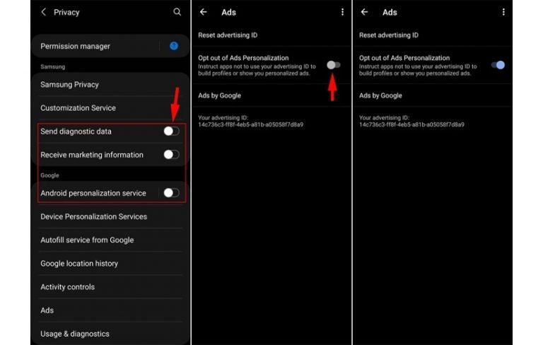 همچنین یک سری داده در گوشی وجود دارد که اگر تنظیمات مربوط به آن فعال باشد، این دادهها برای توسعهدهندگان نرمافزار ارسال میشوند تا اشکالات موجود در آنها پیگیری و رفع شوند. اما اگر به هر دلیلی تمایل ندارید به گوشی اجازهی ارسال دادههای مربوطه را بدهید میتوانید مطابق تصویر زیر آن را غیرفعال کنید. علاوه بر اینها، امکان غیرفعال کردن نمایش تبلیغاتهای شخصیسازی شده هم در این بخش وجود دارد.