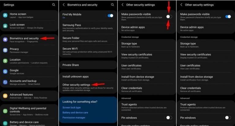 ابتدا وارد تنظیمات شده و در بخش Biometrics and Security، گزینهی Other Security Settings را انتخاب کنید. در این مرحله وارد صفحهای خواهید شد که اولین گزینهی آن، عبارت Make passwords visible به معنای نمایش رمز عبور است. اگر این گزینه را فعال کنید، رمز عبور حین نوشتن به نمایش در میآید و اگر هم غیرفعال باشد، به شکل دایرهی مشکی رنگ خواهند بود.