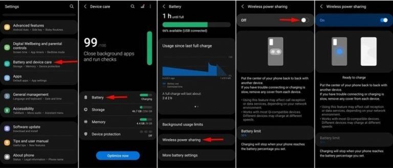 اگر جز آن دسته از کاربرانی هستید که از گلکسی بادز استفاده میکنید یا در نظر دارید آن را خریداری کنید، باید بدانید این امکان وجود دارد که از طریق گوشی خود، این هدفون بیسیم را شارژ کنید. این گزینه در بخش گزینههای مربوط به باتری وجود دارد که میتوانید مطابق تصویر زیر آن را فعال کنید. بعد از این، تنها کافی است کیس هدفون را مطابق تصویر زیر روی پشت دستگاه قرار داده تا محصول مورد نظر شارژ شود.