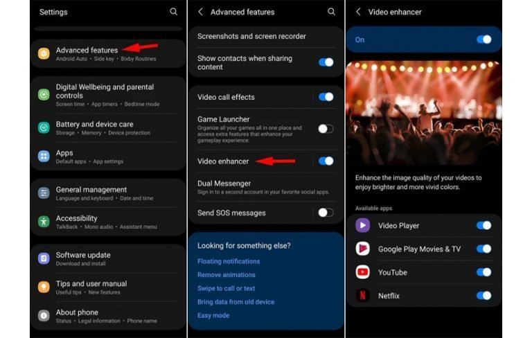 این قابلیت در همان بخش Advanced features وجود دارد که با کلیک روی آن میتوانید به اپلیکیشنهای موجود دسترسی داشته و انتخاب کنید کدام یک از آنها به قابلیت یاد شده دسترسی داشته باشند. اگر میخواهید Video enhancer برای همهی اپلیکیشنها فعال باشد، نیازی نیست وارد آن شوید. صرفا در همان بخش روی آیکون فعال/غیرفعال کلیک کنید تا به صورت پیشفرض این قابلیت برای همهی اپلیکیشنهای مربوطه فعال شود.