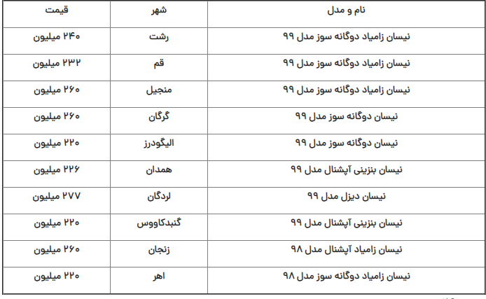 به گزارش سایت طلا،نیسان دیزل مدل ۹۹ نیز با حداکثر قیمت ۲۷۷ میلیون تومان به فروش می رسد.