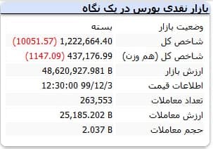 شاخص کل در بازار بورس امروز ۱۰ هزار ۵۱ واحد افت داشت که در نهایت این شاخص به رقم یک میلیون و ۲۲۲ هزار واحد رسید.