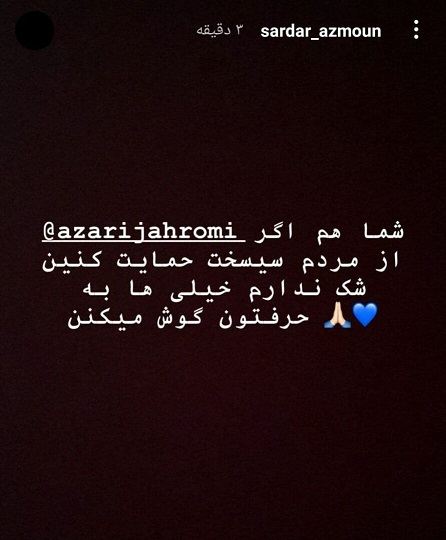 این روز ها که مردم اهالی سیسخت درگیر مشکلات و مسائل مربوط به زلزله اخیر هستند، یکی از چهره های محبوب فوتبالی یعنی سردار آزمون در یک استوری خطاب به وزیر ارتباطات جوان یعنی آذری جهرمی در باب نصیحت مطالبی را بیان کرده است.