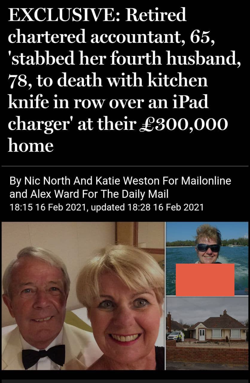 یک زن انگلیسی پس از ایجاد مشاجره بین آنها به دلیل اختلاف بر سر اولویت استفاده از تنها شارژر آیپد در خانه ۱۰۰ میلیاریاش، شوهرش را کشت!
