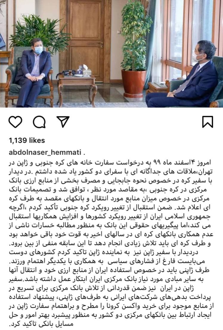 به گزارش سایت طلا، «عبدالناصر همتی»در یادداشت اینستاگرامی خود نوشت: امروز (۴ اسفند ماه ۹۹) به درخواست سفارت خانه های کره جنوبی و ژاپن در تهران، ملاقات های جداگانهای با سفرای دو کشور یاد شده داشتم. در دیدار با سفیر کره در خصوص نحوه جابجایی و مصرف بخشی از منابع ارزی بانک مرکزی در کره جنوبی، به مقاصد مورد نظر، توافق شد و تصمیمات بانک مرکزی در خصوص میزان منابع مورد انتقال و بانکهای مقصد به طرف کره ای اعلام شد.