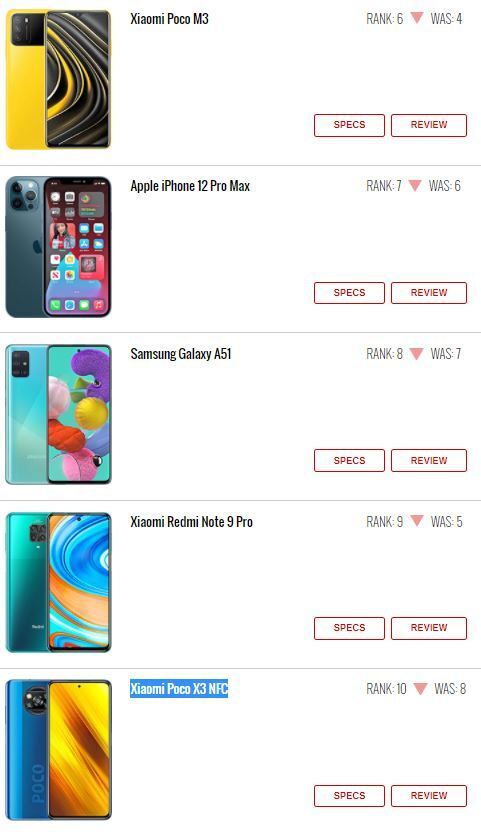آیفون ۱۲ پرو مکس شرکت اپل هم با یک پله نزول به رتبه هفتم سقوط کرده است. گلکسی A۵۱ سامسونگ هم با یک پله نزول از جایگاه هفتم به جایگاه هشتم رسیده، اما هنوز از دو گوشی دیگر ساخته شده توسط شیائومی جلوتر است.
