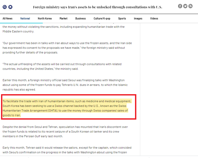 در قسمت دیگری از این گزارش به این نکته اشاره شده است که " کره جنوبی برای تسهیل تجارت کالاهای بشردوستانه با ایران ، مانند دارو و تجهیزات پزشکی، به دنبال استفاده از یک کانال سوئیسی با پشتیبانی ایالات متحده آمریکا، معروف به توافق نامه تجارت بشردوستانه سوئیس (SHTA)، برای فروش کالا به ایران است.