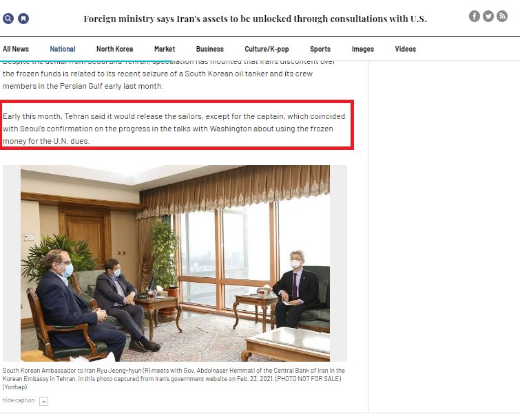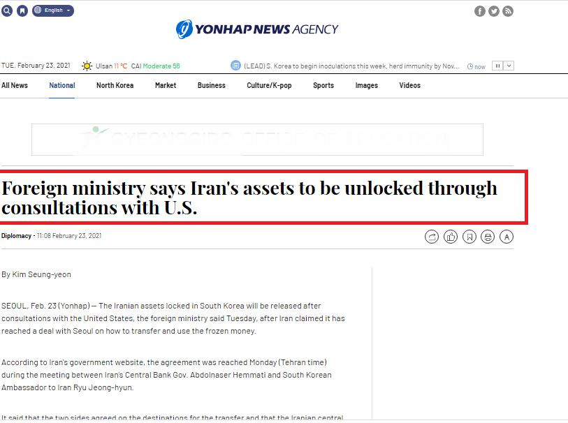 * در تیتر این خبرگزاری(یونهاپ) آمده است که کره جنوبی در حال مذاکره با مقامات واشینگتن برای آزادسازی دارایی های بلوکه شده ایران در آن کشور است و تنها با اجازه این کشور می تواند کاری برای آزادسازی دارایی های مسدود شده ایران در کره جنوبی کند!