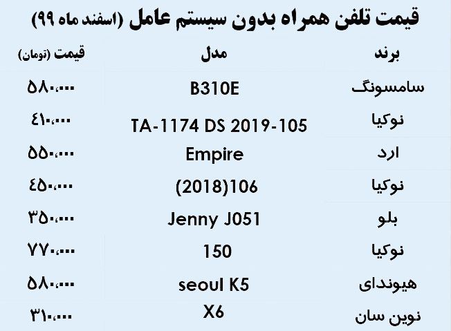 3. لیست قیمت انواع گوشی‌های بدون سیستم عامل 6 اسفند
