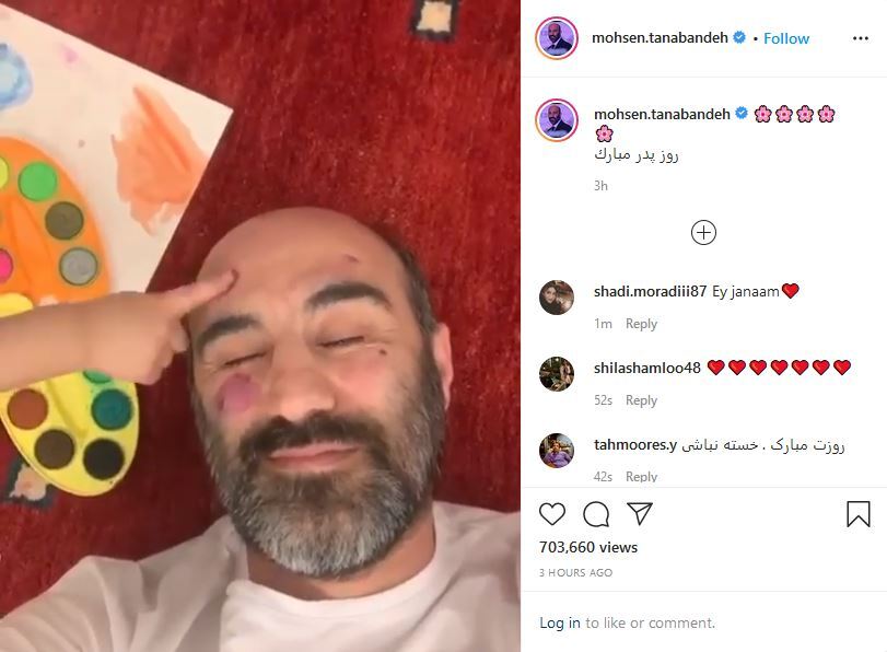 محسن تنابنده به مناسبت روز پدر تصویری از نقاشی فرزندش روی صورت خود را در فضای مجازی با طرفدارانش به اشتراک گذاشت.