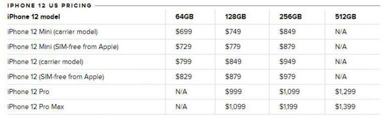 در ادامه جدول قیمتگذاری خانواده آیفون ۱۲ را مشاهده میکنید: