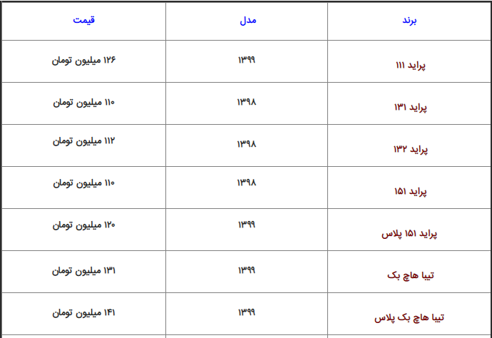 تیبا هاچ بک ۱۳۱ میلیون تومان، ساینا دندهای ۱۳۷ میلیون تومان و وانت زامیاد دو گانه سوز هم بهقیمت ۲۴۴ میلیون تومان در بازار حضور دارند. قیمت دیگر محصولات سایپا را میتوانید در جدول زیر مشاهده کنید.