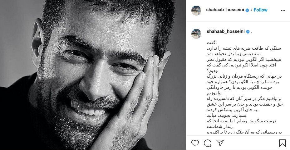 شهاب حسینی در اینستاگرام نوشته است: «گفت: سنگی که طاقت ضربههای تیشه را ندارد، به تندیسی زیبا بدل نخواهد شد.