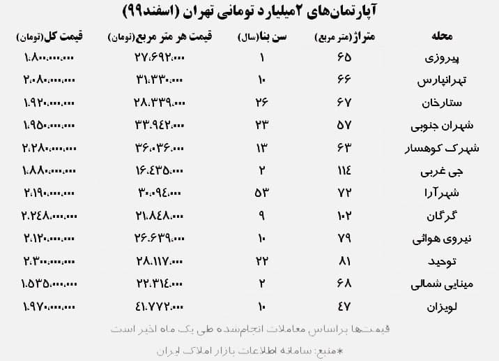 لازم به ذکر است که قیمتها بر اساس معاملات انجام شده طی یک ماه اخیر (بر اساس آمار سازمان ثبت اسناد و املاک کشور) است. این جدول فقط نمونهای از خرید و فروشهای آپارتمانهای ۲ میلیارد تومانی تهران است که در یک ماه اخیر در تهران انجام شده و به طور مطلق بیانگر میانگین نرخ مسکن در محلههای یادشده نیست.