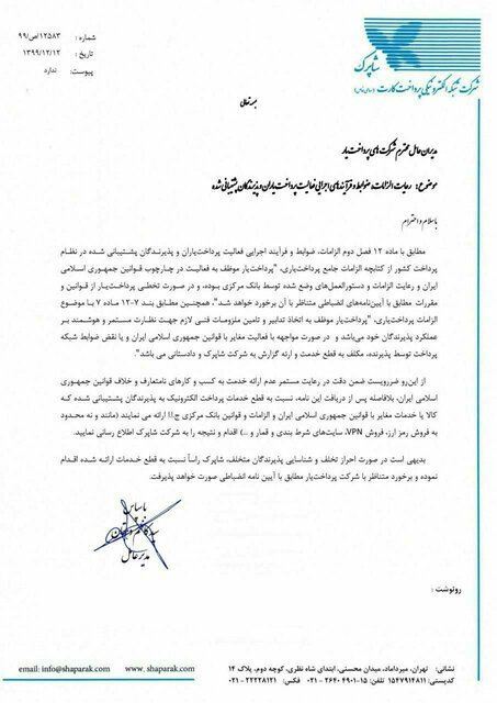پس از طرح این موضوعات، شرکت شاپرک در نامهای به پرداخت یاران و پذیرندگان پشتیبانی شده در نظام پرداخت کشور اعلام کرد که ضروری است ضمن دقت در رعایت مستمر عدم ارائه خدمت به کسبوکارهای نامتعارف و خلاف قوانین جمهوری اسلامی ایران، بلافاصله پس از دریافت این نامه نسبت به قطع خدمات پرداخت الکترونیک به پذیرندگان پشتیبانی شده که کالا یا خدمات مغایر با قوانین جمهوری اسلامی ایران و الزامات بانک مرکزی ارائه میکنند (مانند و نه محدود به فروش رمز ارز، فروش VPN، سایتهای شرط بندی و قمار و...) اقدام و نتیجه را به شرکت شاپرک اطلاع رسانی کنند.