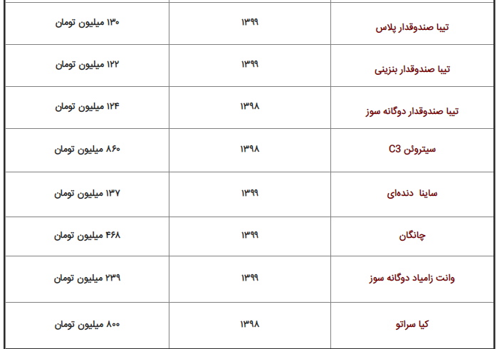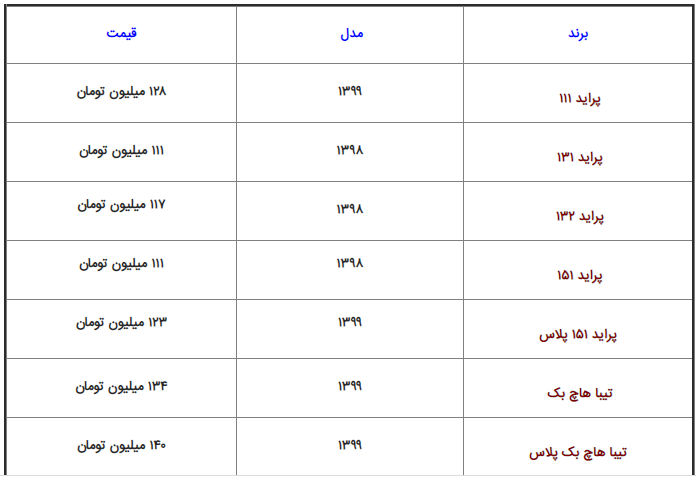 | مدل خودرو | قیمت (تومان) |
