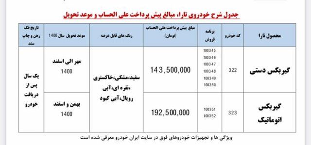 علاوهبراین گروه صنعتی ایرانخودرو، همزمان با اجرای چهاردهمین مرحله از فروش فوقالعاده دو محصول خود، سومین مرحله از پیشفروش خودروی تازه وارد خودرو " تارا" را در دو مدل دستی و اتوماتیک به مرحله اجرا گذاشته است که براساس آن موعد تحویل تارا با گیربکس دستی، مهر الی اسفند ۱۴۰۰ و خودرو تارا با گیربکس اتوماتیک بهمن الی اسفند ماه ۱۴۰۰ خواهد بود. قیمت هر دو نوع این خودرو، مطابق با زمان قیمت خودرو در روز تحویل خواهد بود.