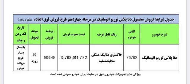همچنین در چهاردهمین مرحله از فروش فوقالعاده محصولات گروه صنعتی ایرانخودرو، خودرو دناپلاس توربواتوماتیک نیز طبق روال مرسوم فروشهای فوقالعاده با قیمت قطعی و موعد تحویل ۹۰ روزه عرضه شده است.