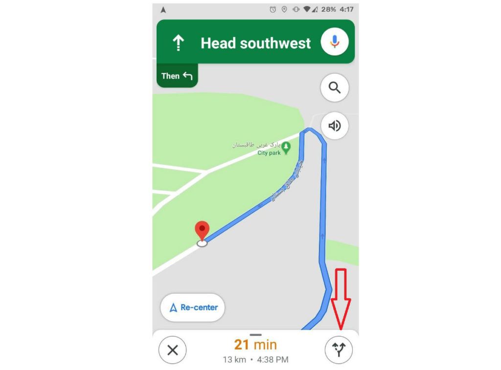 در صورتی که روی گزینه مشخص شده در تصویر زیر ضربه بزنید، مسیرهای جایگزین هم به شما نشان داده میشود اما معمولا مسیر اولیهای که خود مپس پیشنهاد میکند، بهترین گزینه است.