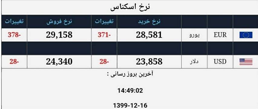علاوه بر این، نرخ خرید یورو در بازار ۲۹ هزار و ۵۸ تومان و نرخ فروش آن ۲۹ هزار و ۳۴۹ تومان اعلام شد.