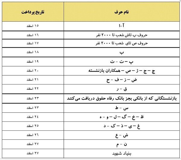 پرداخت حقوق بازنشستگان و مستمری بگیران سازمان تأمین اجتماعی از ۱۵ اسفند آغاز شده و تا ۲۷ اسفند و براساس حروف الفبا به حساب آنان واریز میشود.