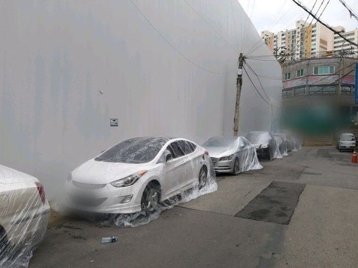 9. این عکس دیواری است که شرکت ساخت خانه ساخته است تا گرد و غبار وارد خانه همسایه ها نشود. همچنین برای محافظت از خودرد دیگران بر روی آنها کیسه نایلونی کشیده اند.