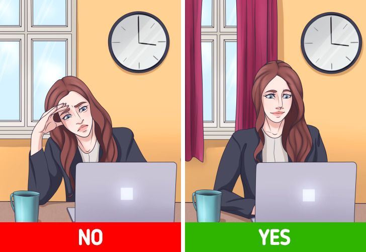 1. هنگام استفاده از لپ تاپ جلوی تابش شدید و مستقیم نور را بگیرید.برای اینکار می توانید پرده اتاق را کشیده و یا نور چراغ ها را کم کنید.