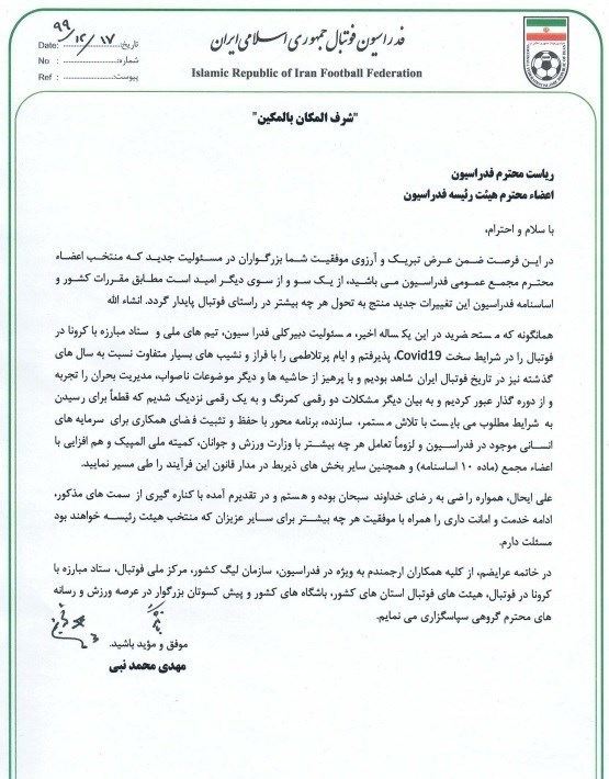 به گزارش سایت طلا،مهدی محمدنبی دبیرکل فدراسیون فوتبال با ارسال نامهای به شهابالدین عزیزی خادم رئیس فدراسیون فوتبال و اعضای هیئت رئیسه، از سمت خود استعفا کرد. تصویر نامه دبیرکل فدراسیون در زیر آمده است: