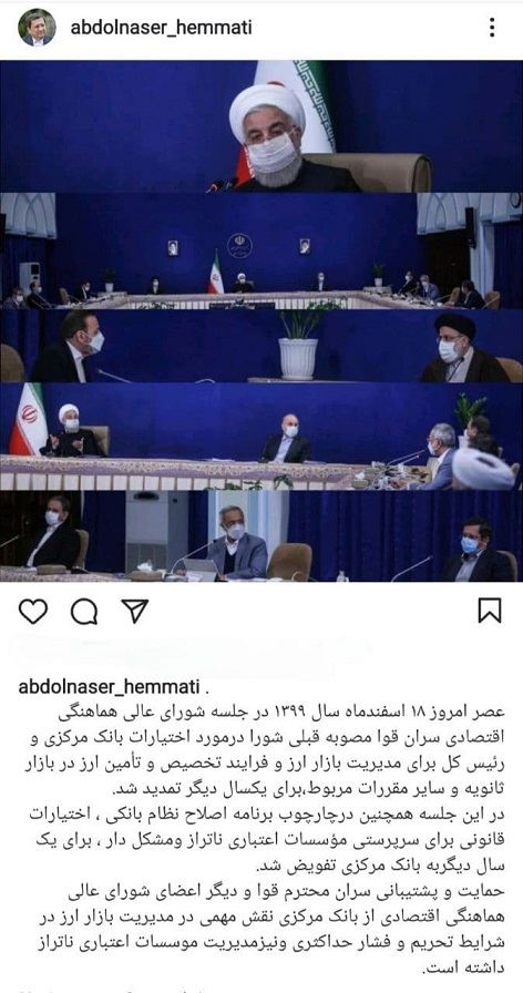 عبدالناصر همتی رئیس کل بانک مرکزی در یادداشت اینستاگرامی خود درباره جلسه شورای عالی هماهنگی اقتصادی سران قوا نوشت :