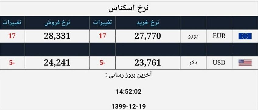 علاوه بر این، نرخ خرید یورو در بازار ۲۸ هزار و ۲۰۱ تومان و نرخ فروش آن ۲۸ هزار و ۴۸۳ تومان اعلام شد.