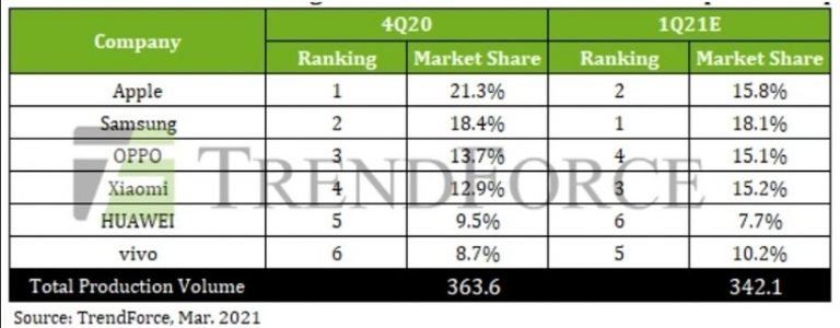 اگر پیشبینیهای ترندفورس درست از آب دربیاد، صدرنشینی کوتاه مدت اپل به عنوان برترین فروشندهی گوشی هوشمند در جهان بهزودی به اتمام میرسد و این سامسونگ خواهد بود که این جایگاه را بار دیگر تصاحب میکند؛ البته فقط در همین سه ماه نخست ۲۰۲۱، چرا که مشخص نیست طی سهماه بعد چه اتفاقاتی رخ خواهد داد. اپل سه ماه آخر سال گذشته را با تولید ۷۷.۶ میلیون آیفون به پایان رساند که حدودا ۹۰ درصد آن به سری آیفون ۱۲ تعلق داشت. اپل با این میزان توانست به نسبت سه ماه سوم سال ۲۰۲۰، حدودا ۸۵ درصد، آمار تولید گوشیهای خود را بهبود ببخشد که رقم بسیار قابل توجهی است.