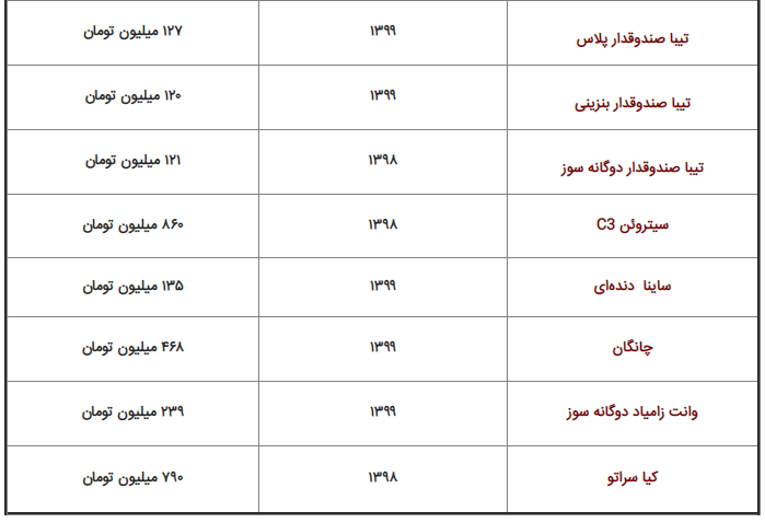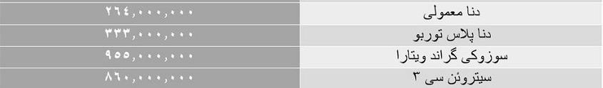در بین خودروهای گروه سمند اما سمند ال ایکس در این مدت بر روی ۱۸۳ میلیون تومان ثابت مانده است و از طرف دیگر مدل ال ایکس ای اف ۷ این گروه از ۲۰۰ میلیون تومان در روز گذشته به ۱۹۸ میلیون تومان رسیده است و در بین خودروهای گروه دنا نیز در این مدت ثبات قیمت دیده می شود به طوری که دنا پلاس توربو امروز بدون تغییر نسبت به روز گذشه ۳۳۳ میلیون تومان قیمت خورده است و دنا معمولی نیز طی ۲۴ ساعت گذشته بر روی ۲۶۴ میلیون تومان ثابت مانده است. این ثبات قیمت ها در بین انواع مدل های گروه تیبا نیز دیده می شود به طوری که تیبا ۲ از روز گذشته تاکنون بر روی ۱۳۰ میلیون تومان ثابت مانده است و تیبا صندوقدار نیز بدون تغییر نسبت به روز گذشته امروز ۱۲۰ میلیون تومان قیمت خورده است.