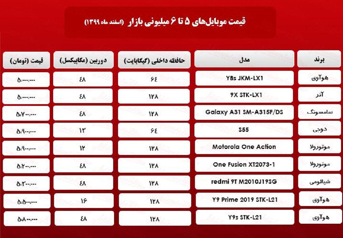 به گزارش موبوایران، آنچه در زیر میآید قیمت انواع موبایل ۵ تا ۶ میلیون تومانی در سطح بازار تهران است.