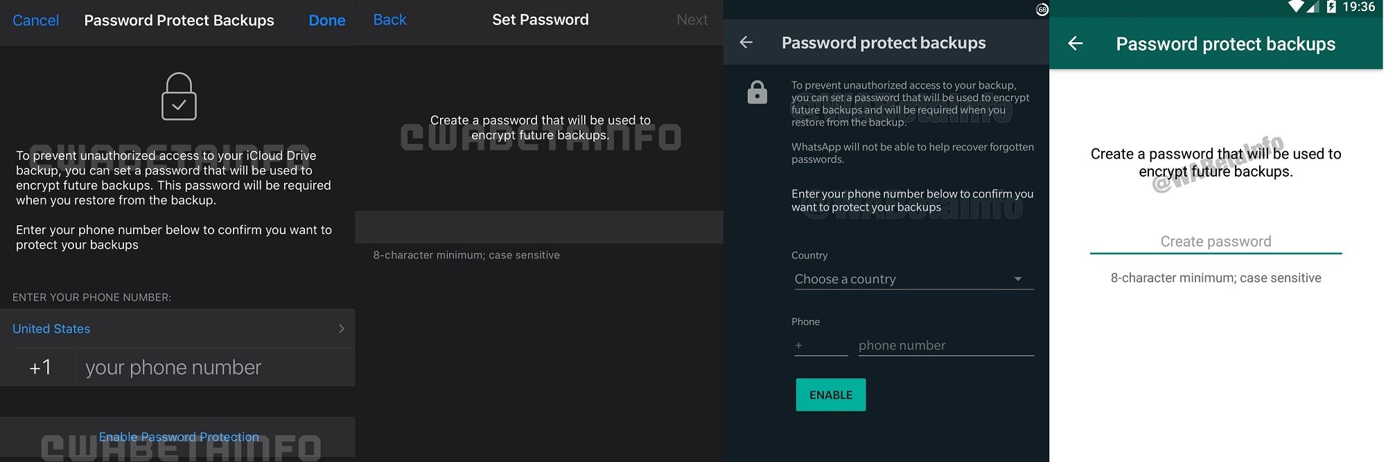 در یکی از این تصاویر، که توسط وبسایت WABetaInfo منتشر شده، آمده است: «برای جلوگیری از دسترسی غیرمجاز به پشتیبان iCloud Drive میتوانید پسوردی انتخاب کنید تا پشتیبانهای آینده شما با کمک همین پسورد رمزنگاری شوند. برای برگرداندن پشتیبانها در آینده به این پسورد نیاز خواهید داشت.» اپلیکیشن سپس از کاربر میخواهد که شماره تماس خود را تایید کند و پسوردی بنویسد که حداقل ۸ پارامتر دارد. در بخش دیگری هشدار داده شده که واتساپ نمیتواند بکاپها را در صورت فراموشی پسورد بازیابی کند.