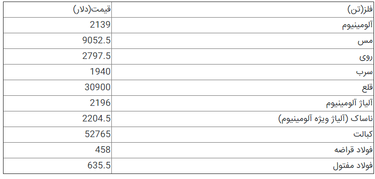 جدیدترین قیمت فلزات اساسی که در بازار بورس فلزات لندن معامله میشود، به این شرح است: