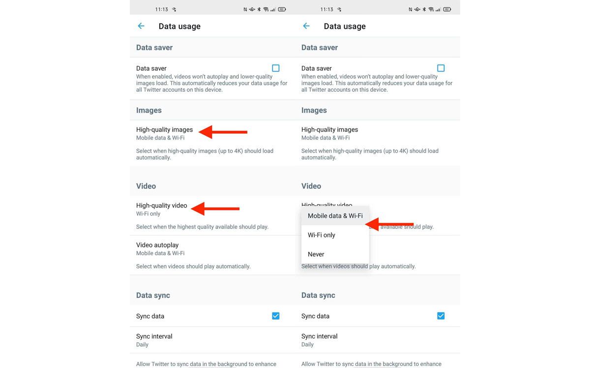 برای فعال‌سازی امکان آپلود تصاویر با وضوح بالاتر، لازم است روی منوی تنظیمات (سه خط) در گوشه بالا سمت چپ صفحه ضربه بزنید و سپس وارد بخش Settings and privacy و بعد Data usage شوید. در بخش «تصاویر»، روی تصاویر با کیفیت بالا (High-quality images) ضربه بزنید. در آخر می‌توانید انتخاب کنید که تصاویر 4K در کدام حالت Mobile data & Wi-Fi یا Wi-Fi only آپلود شوند.