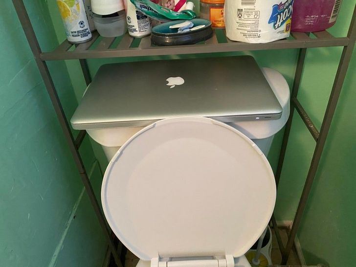 6. شوهر این خانم لپ تاپ خود را بالای سرویس بهداشتی جا گذاشته است.