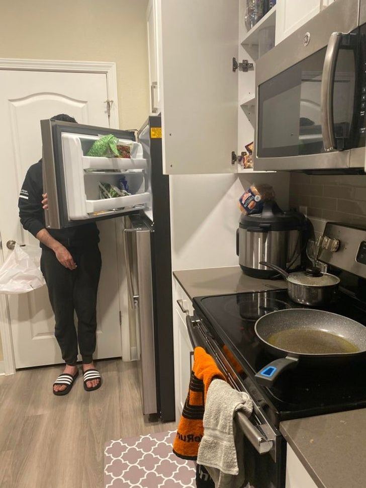 2. هنگام پخت غذا شوهر این خانم پشت فریزر قایم شده تا مانع پاشش قطره های روغن به خود شود.