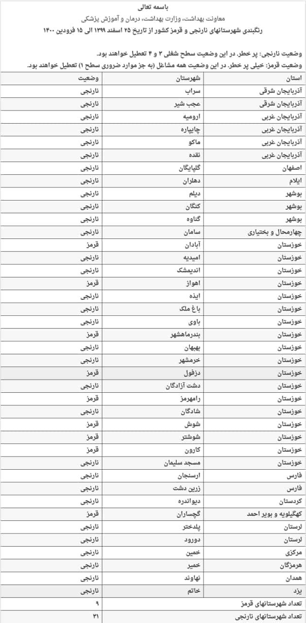 برابر تکلیف قانونی مصوب در ستاد ملی، مسافرت"از" و "به" شهرهای نارنجی و قرمز ممنوع می باشد. بر همین اساس، مقرر گردید تا لیست آخرین وضعیت شهرها در ۲۵ اسفند ماه به استحضار ملت شریف رسانده شود. در این راستا اطلاعیه حاضر ضمن اعلام لیست مذکور، نکات مهم ذیل را نیز اعلام تا به صورت جدی از سوی همه مردم مورد توجه و رعایت قرار گیرد: