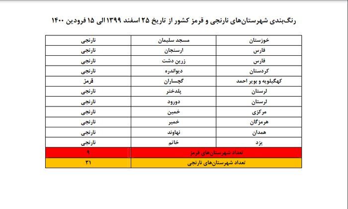 بنابر اعلام وزارت بهداشت فهرست شهرهای قرمز و نارنجی کرونا در ایام نوروز ۱۴۰۰ که سفر به آنها ممنوع است، اعلام شد.