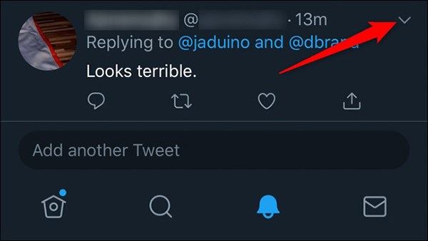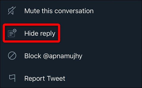 پس از اینکه کاربری در مورد توئیت شما نظر خود را مینویسد توئیتی نمایش داده میشود گه در گوشه سمت راست بالای آن فلشی به سمت پایین قرار دارد. با کلیک کردن به آن فلش میتوان پاسخی که کاربر به توئیت شما داده است را پنهان(hide) کنید.